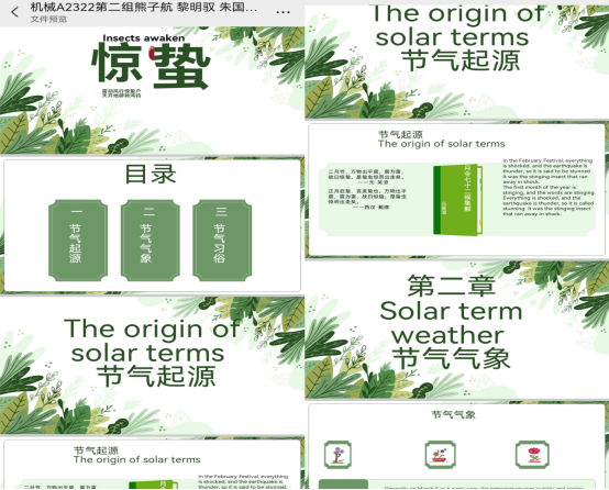 小组作品PPT展示Presentation: 中国二十四节气之一---惊蛰Insects Awaken,了解节气起源,气象和传统习俗,体会养生“人与自然”的和谐理论。