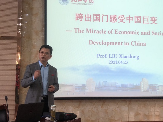 4月23日世界读书日,在学校党史学习教育深入开展之际,校长刘晓东教授应邀在香远楼三楼报告厅为beat365英国官方网站师生作了一场题为《跨出国门感受中国巨变——The Miracle of Economic and Social Development in China》的精彩讲座。beat365英国官方网站党政班子成员及300余名师生代表聆听了刘校长的讲座。