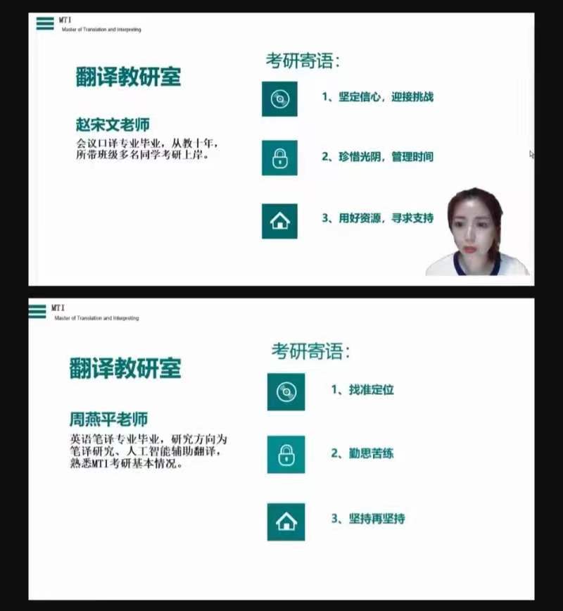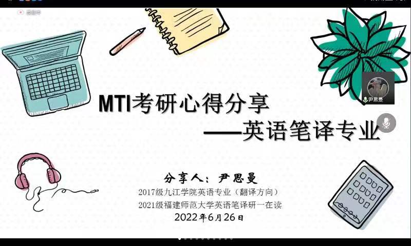 暑期将至,考研备考正当时。beat365英国官方网站一直高度重视考研工作,通过多种举措鼓励广大学生积极参加考研。在学院领导的支持和关心下,近年来学院考研率节节攀升,屡创佳绩。为进一步帮助学生明确考研目标,掌握考研技巧,解答相关考研困惑,beat365英国官方网站翻译教研室于6月26日线上举办翻译专业MTI考研经验交流会。本次会议由翻译教研室主任赵宋文主持,翻译教研室教师周燕平发言,7位成功考取翻译硕士MTI的同学主讲。学院各级各专业近百名学生参会。