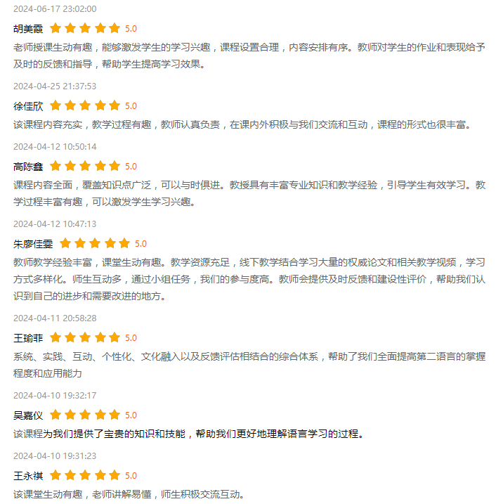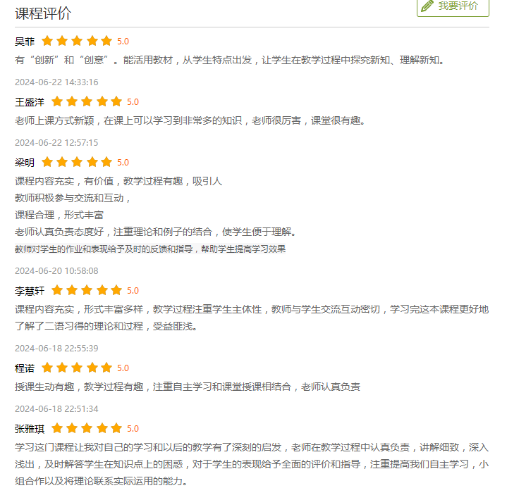 《二语习得》课程教学团队不断更新教学内容,改进教学方法,实现了价值塑造、知识传授和能力培养的有机结合。学生们普遍认为,新的教学模式使他们更容易把握学科知识的关键点,并对专业知识、科学精神和行业规范有了更清晰的认识。在课后评价中,外语A2111班张雅琪同学表示:“学习这门课程让我对自己的学习和以后的教学有了深刻的启发,老师在教学过程中认真负责,讲解细致,深入浅出,及时解答学生在知识点上的困惑,对于学生的表现给予全面的评价和指导,注重提高我们自主学习,小组合作以及将理论联系实际运用的能力。”该班其他同学对校内外“三师”在教学过程中重视价值观培养、强调实践和责任心、以及对教学和科研的敬畏之心表示了高度认可。