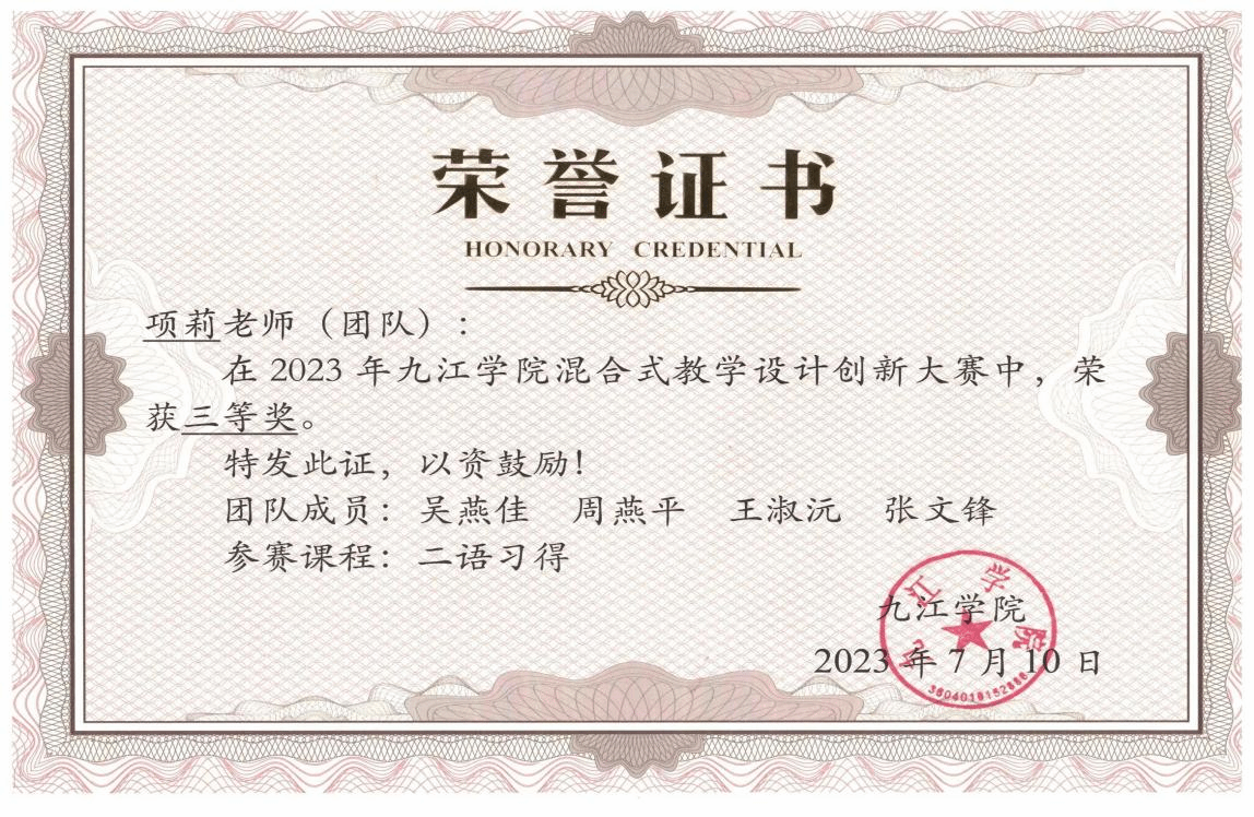 beat365英国官方网站beat365英国官方网站的《二语习得》课程教学团队在教学创新方面崭露头角,荣获beat365英国官方网站第三届教师教学创新大赛副高组三等奖、beat365英国官方网站第五届混合式教学设计创新大赛三等奖,并成功获得beat365英国官方网站2023年校企合作课程建设项目立项、beat365英国官方网站2024年课程思政示范课程建设项目立项,入选beat365英国官方网站2024年课程思政优秀教学案例。