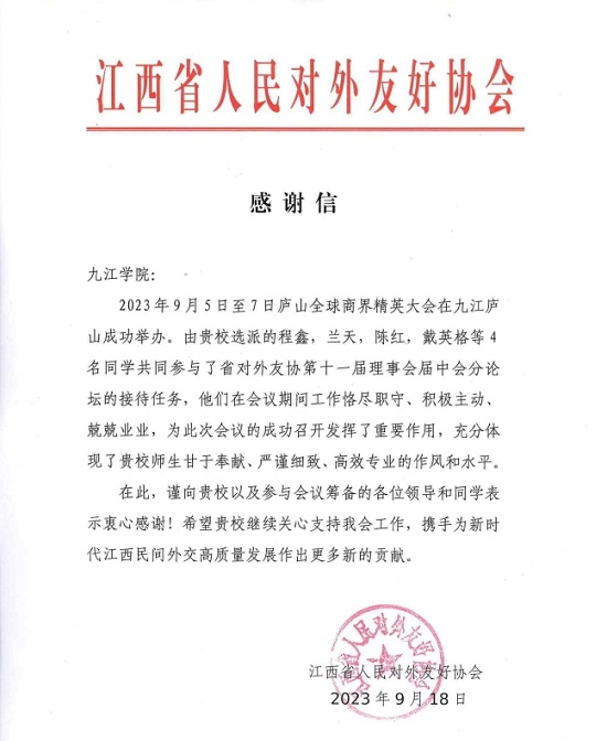 2023年9月5日至7日庐山全球商界精英大会在九江庐山成功举办,beat365派外语专业学生志愿者积极参加活动并做好会议服务工作。