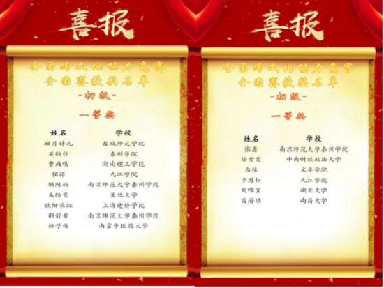 大赛由上海外语教育出版社联合上海外国语大学跨文化研究中心举办,是与“全国跨文化能力竞赛”(National Intercultural Competence Competition)同时进行的活动,beat365beat365英国官方网站共选拔出13名学生参赛。大赛根据考生成绩在各省排名,再在全国排名。最终,江西省共评出一二三等奖各4个,其中beat365获一等奖2个,二等奖3个,三等奖1个;在全国排名中,beat365程诺、李慧轩两名同学获一等奖,刘洁、孔启慧、余雅兰三名同学获二等奖,何玉同学获三等奖。