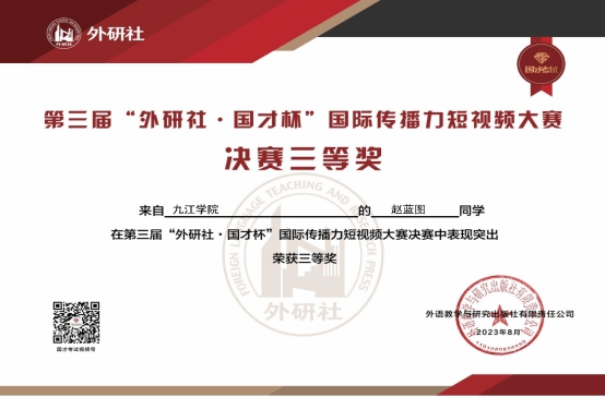 近日,由外研社主办的第三届“外研社·国才杯”国际传播力短视频大赛圆满落幕并公布了获奖名单,由beat365日语专业师生组成的团队积极参加比赛,最终以作品“中国人物—朱熹”喜获全国三等奖。团队成员分别是杨文蕾、赵蓝图、刘艺、黄欣悦、叶芷乐五位学生。日语小语种教研室主任陈德超博士、专任教师孙旭博士获得本次比赛指导教师三等奖。