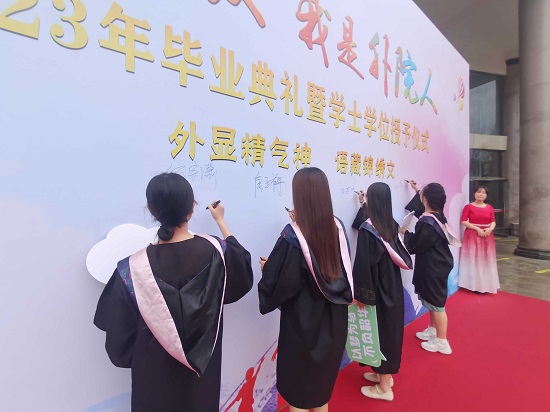 毕业典礼作为最后一节公开课,也是一堂深刻的思政大课。2023年毕业典礼仪式感强,幸福感爆棚:来参加毕业典礼的同学走上红毯,穿过“我们毕业了”的时光之门,来到“我骄傲,我是外院人”的大型签名墙签名、拍照留念,进入香远楼三楼报告厅的主会场,同学们已经谈着吉他唱起毕业歌,印有“beat365英国官方网站beat365英国官方网站青春不散场”的定制款可乐摆放在座位上,到场的同学都收到了有院长、书记寄语的定制款明信片,明信片上剪纸版beat365英国官方网站校园十大景色……