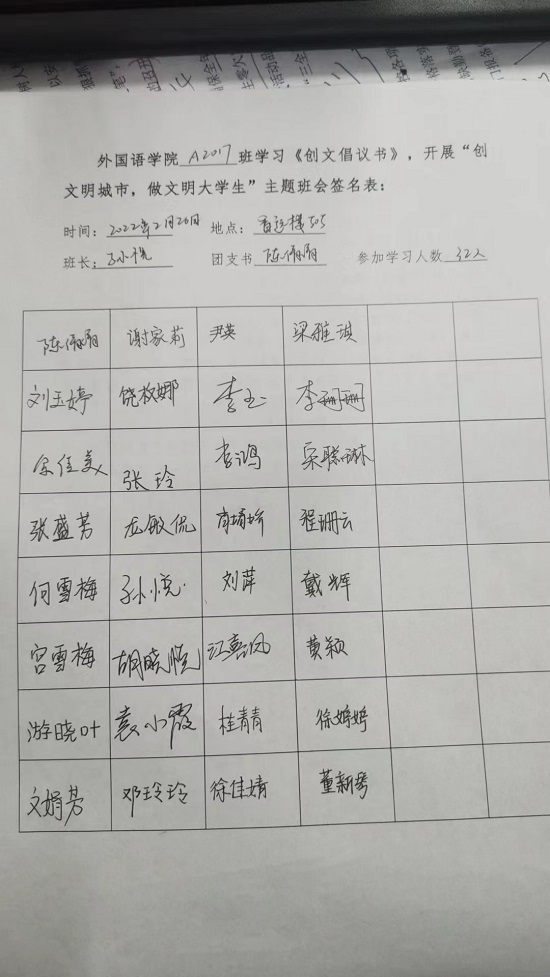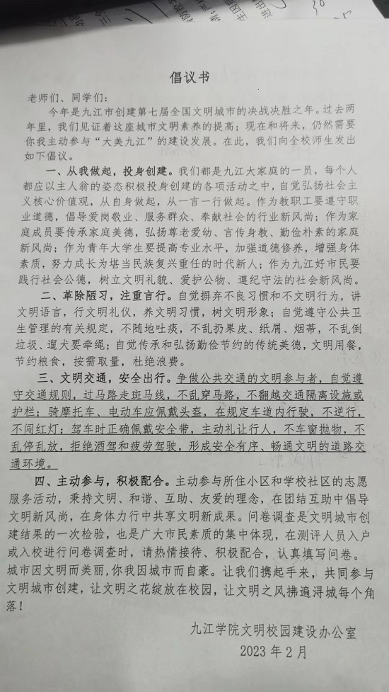 学习完beat365英国官方网站《创文倡议书》后,在倡议书上签名,并表示会用实际行动践行社会主义核心价值观,做文明当学生,为九江市创文工作贡献力量。