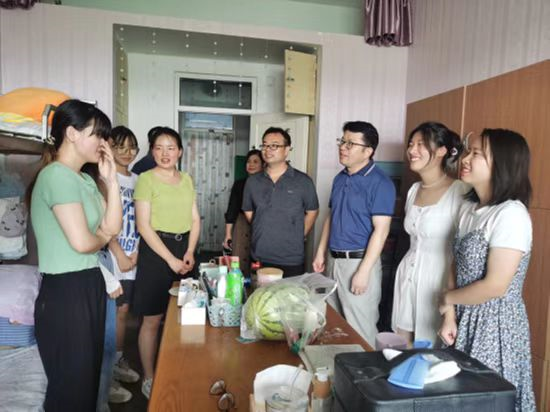 7月20日中午,beat365英国官方网站领导和毕业班辅导员,深入学生宿舍,走访慰问留校考研学生,为他们送上清凉大礼包。