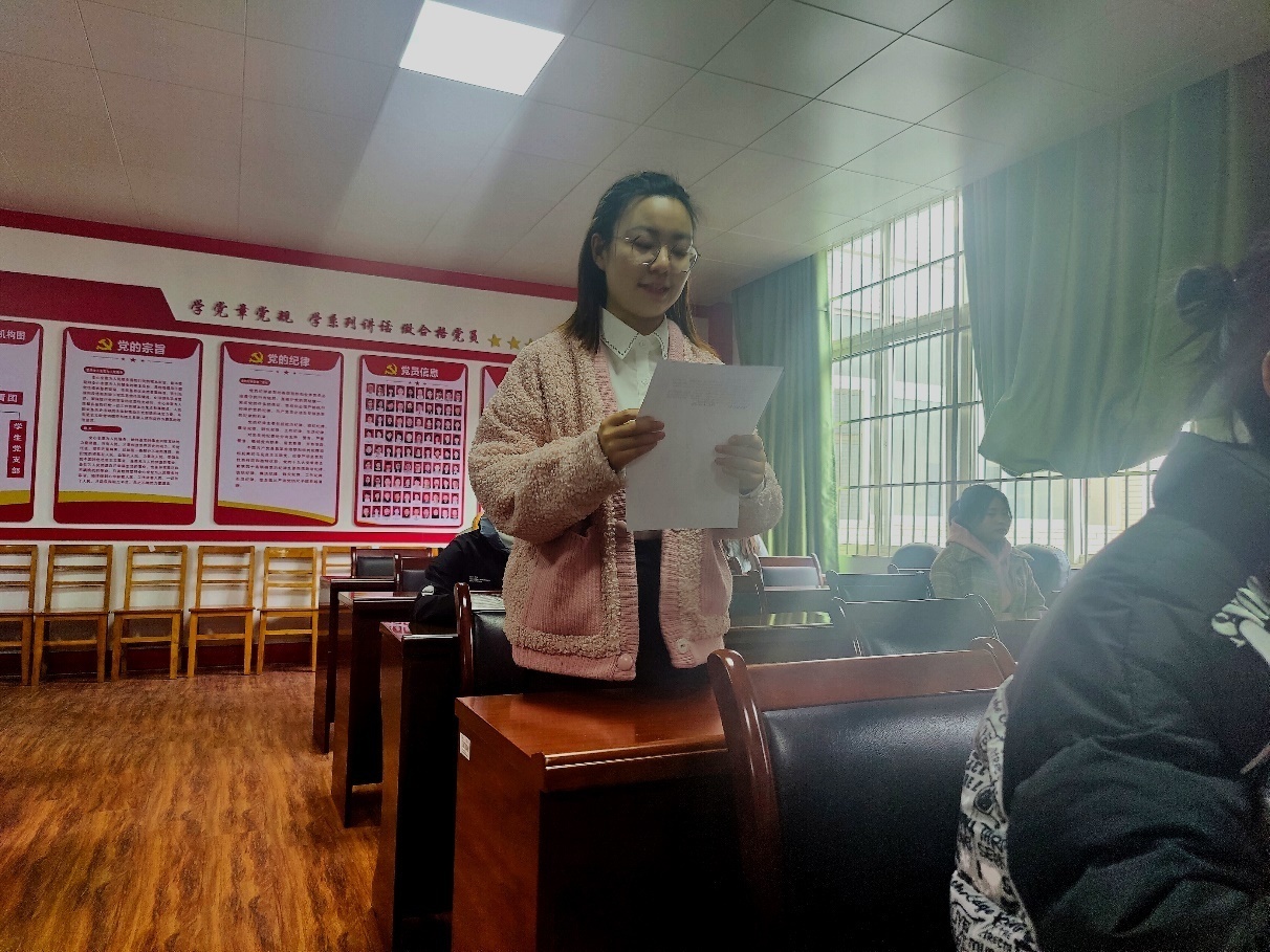 随后,大家在A1911班李晓玲的带领下宣读入党宣言,进行宣誓。宣誓完毕,A1933班邱蓓蓓代表预备党员发言,她表示,感谢组织给予这次来之不易的机会,同时也会牢记党员的义务,以更高的标准来要求自己。随后A1941班张舒宁代表入党积极分子发言,她表明了自己努力向党组织靠拢的决心,努力向预备党员们学习,并表示今后在各个方面严格要求自己。