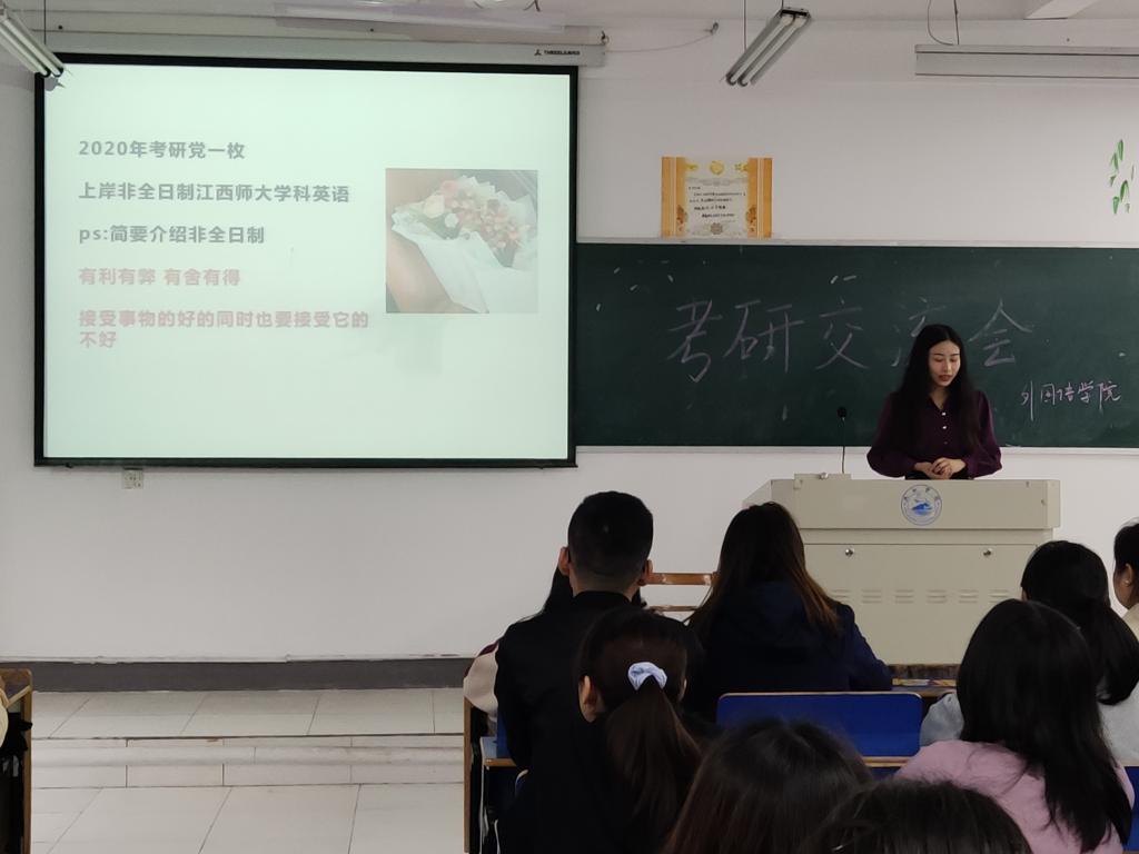 活动过程中,罗莎、邱淼洋、赖伟桢、兰琪、周婷婷五位考研优异的学长学姐分享了自己的考研经验,并耐心解答了同学们在考研和学习中遇到的困惑。分享过程中提到学习目标的设定是非常重要的,只有找准目标、坚定目标,才能朝着自己理想的方向前进;要高度重视口语的练习和提高,训练自己的听说读写译技能。最后,他们对beat365英国官方网站的同学们寄予真诚祝福,希望同学们确立自己的目标,好好学习,考研都能成功上岸。