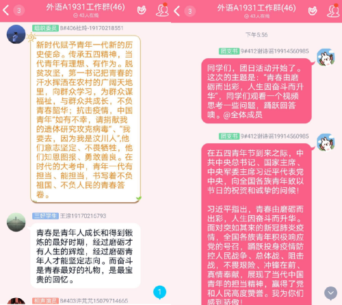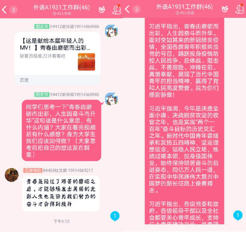 吾辈中国,青年奋起。为纪念“五四运动”101周年,贯彻落实习近平总书记寄语新时代青年的讲话精神,让广大团员切身认识到五四精神的重要性,让中国精神焕发光彩、薪火相传,5月7日beat365英国官方网站大一年级各班运用微信、腾讯QQ等平台,以在线共同观看视频、讨论相关图片等形式开展了以“青春由磨砺而出彩,人生因奋斗而升华”为主题的线上团日活动。