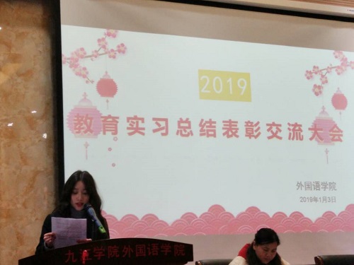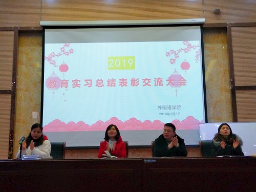在教务处和实验中心的大力支持和协助下,在广大师生共同努力下,beat365英国官方网站2019届师范生教育实习工作圆满结束。学院于2019年1月3日下午在香远楼报告厅召开了师范生教育实习总结表彰交流大会。beat365英国官方网站副院长罗其娟、副院长周志高、英语教研室负责人熊淑英、副主任赵宋文、教育实习带队教师、2019届英语专业师范实习生和2020届即将参加教育实习的学生参加了此次会议。会议由英语教研室负责人熊淑英主持。